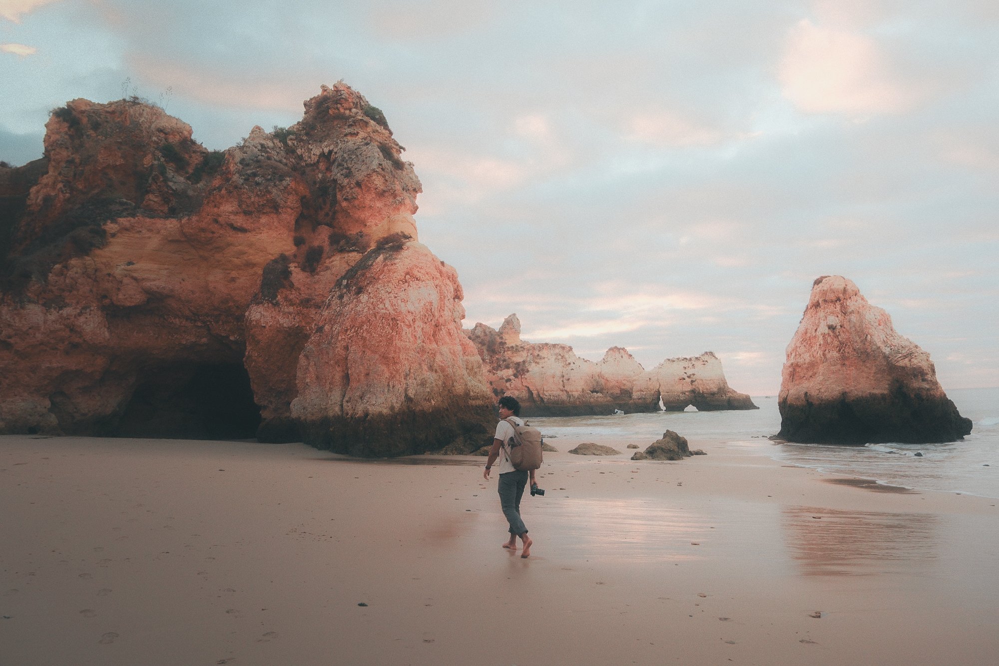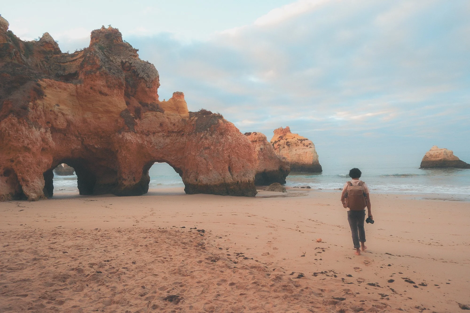 Person walking on sandy beach with backpack, holding camera, near large rock formations with arches by the ocean under cloudy sky.
