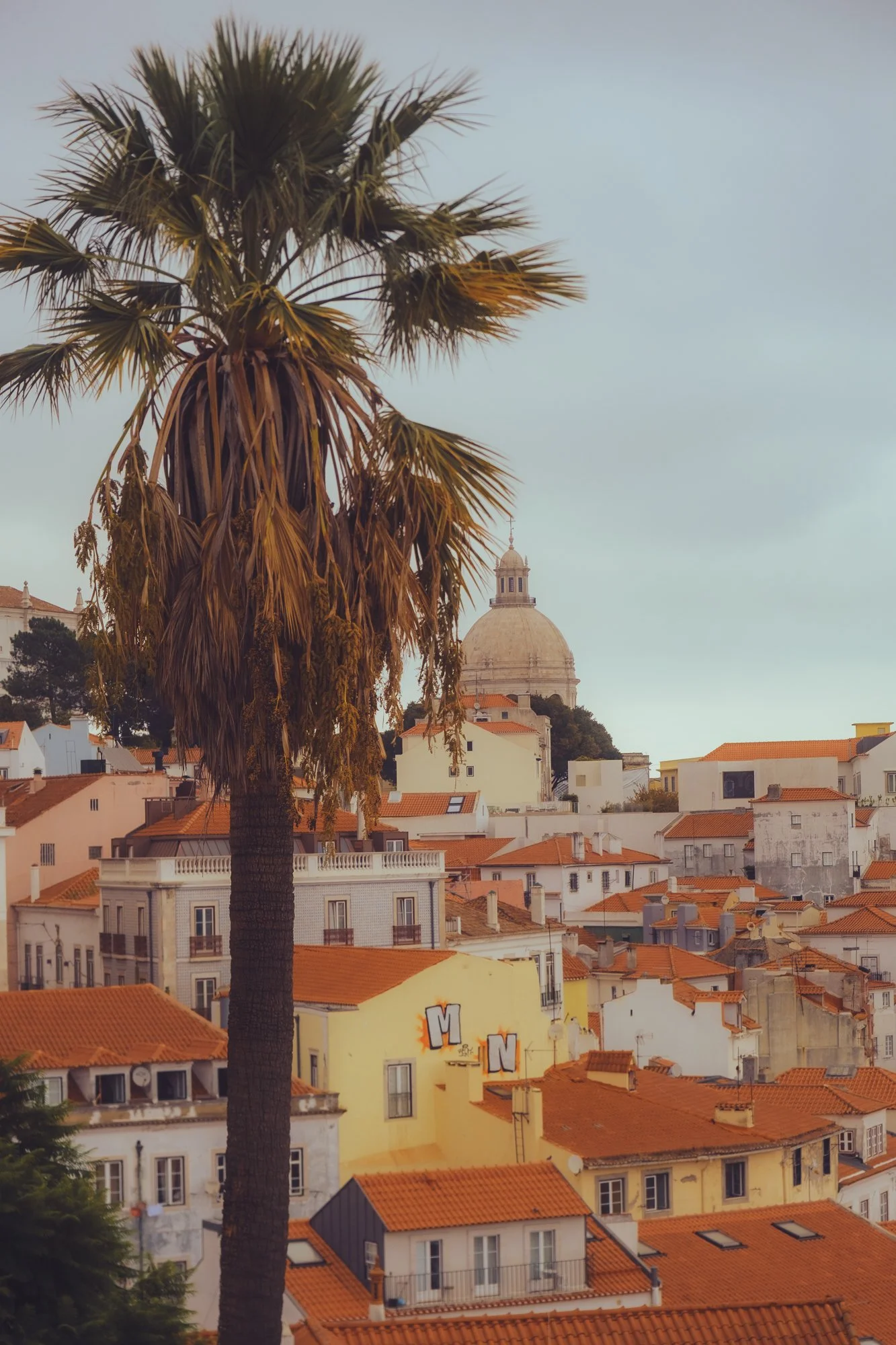 A cityscape featuring a tall palm tree in the foreground, with orange-roofed buildings and a dome structure with a spire in the background, under a cloudy sky.