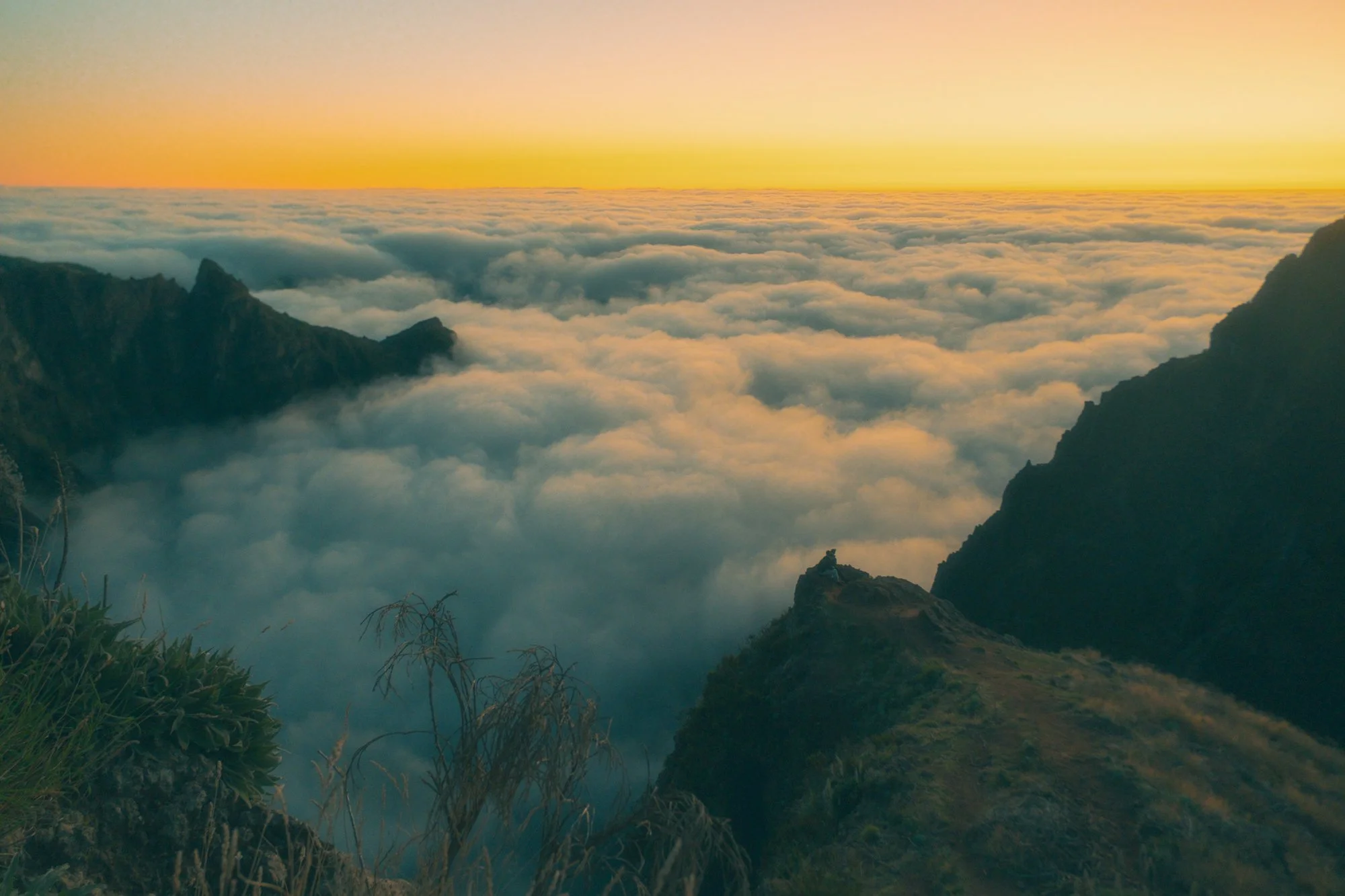 A mountain landscape at sunset with clouds covering the valleys below, and rugged peaks silhouetted against a yellow-orange sky.