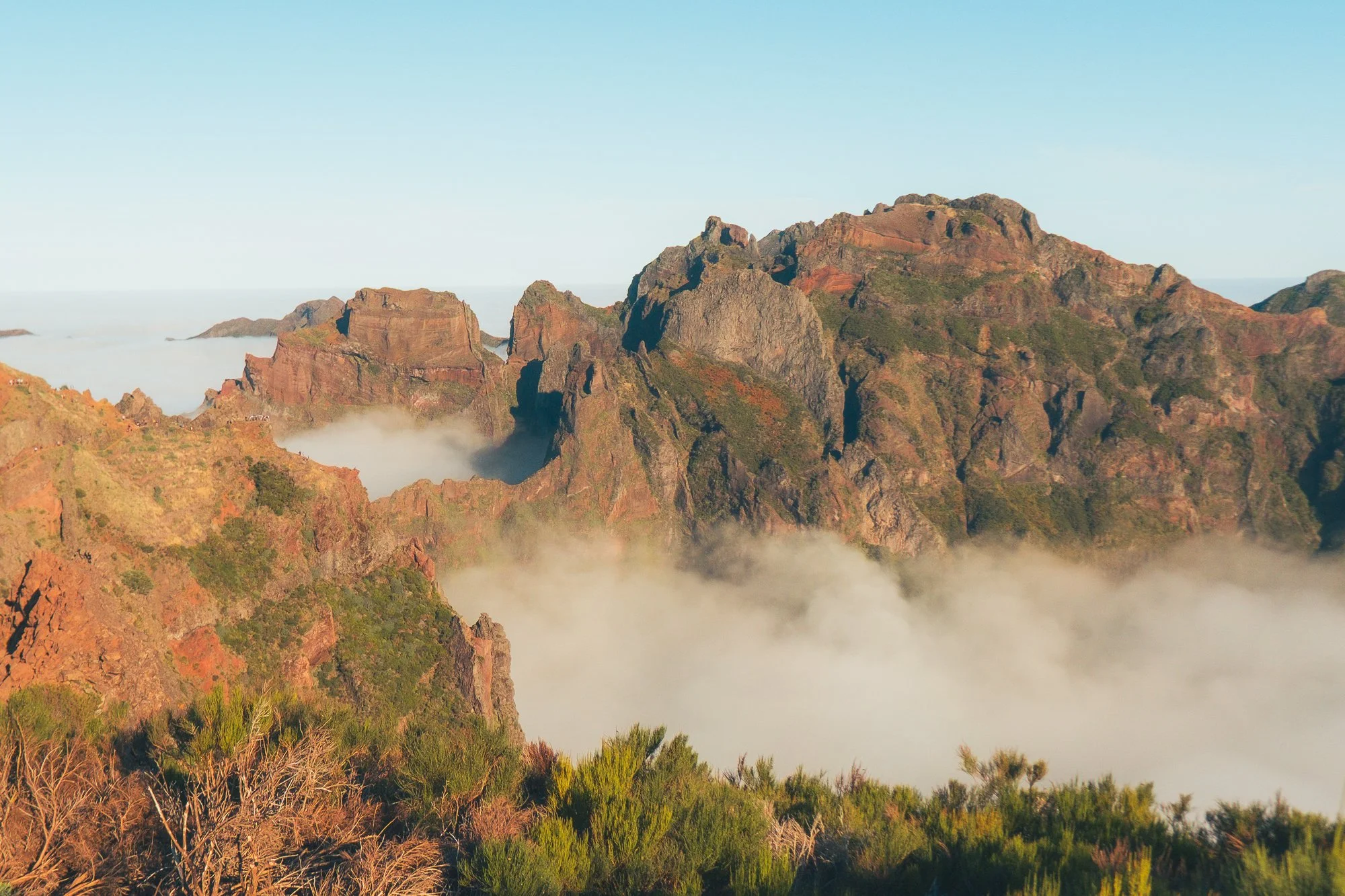 A scenic view of rugged, reddish-brown mountain peaks with green vegetation, surrounded by low-hanging clouds and a clear blue sky.