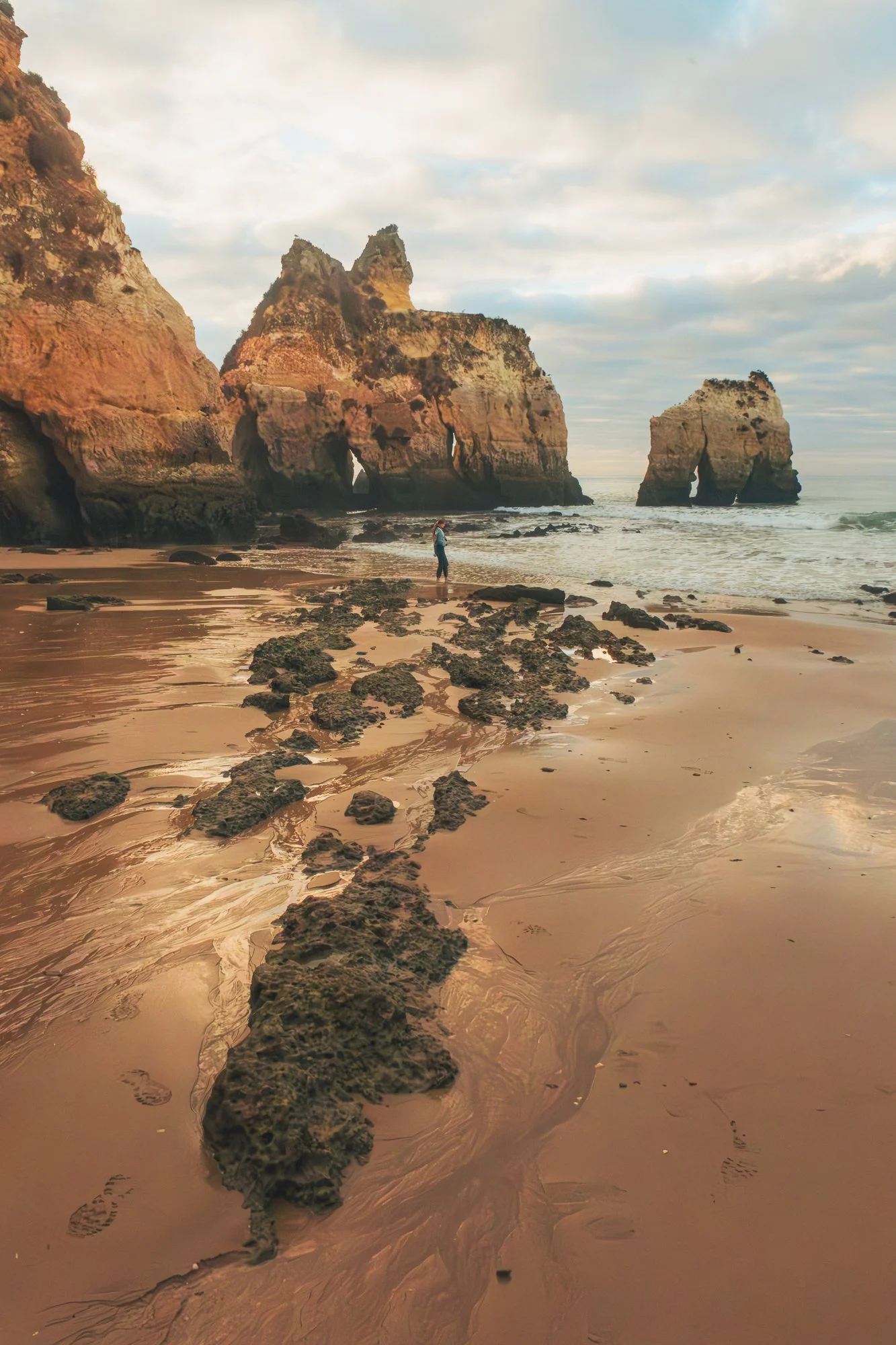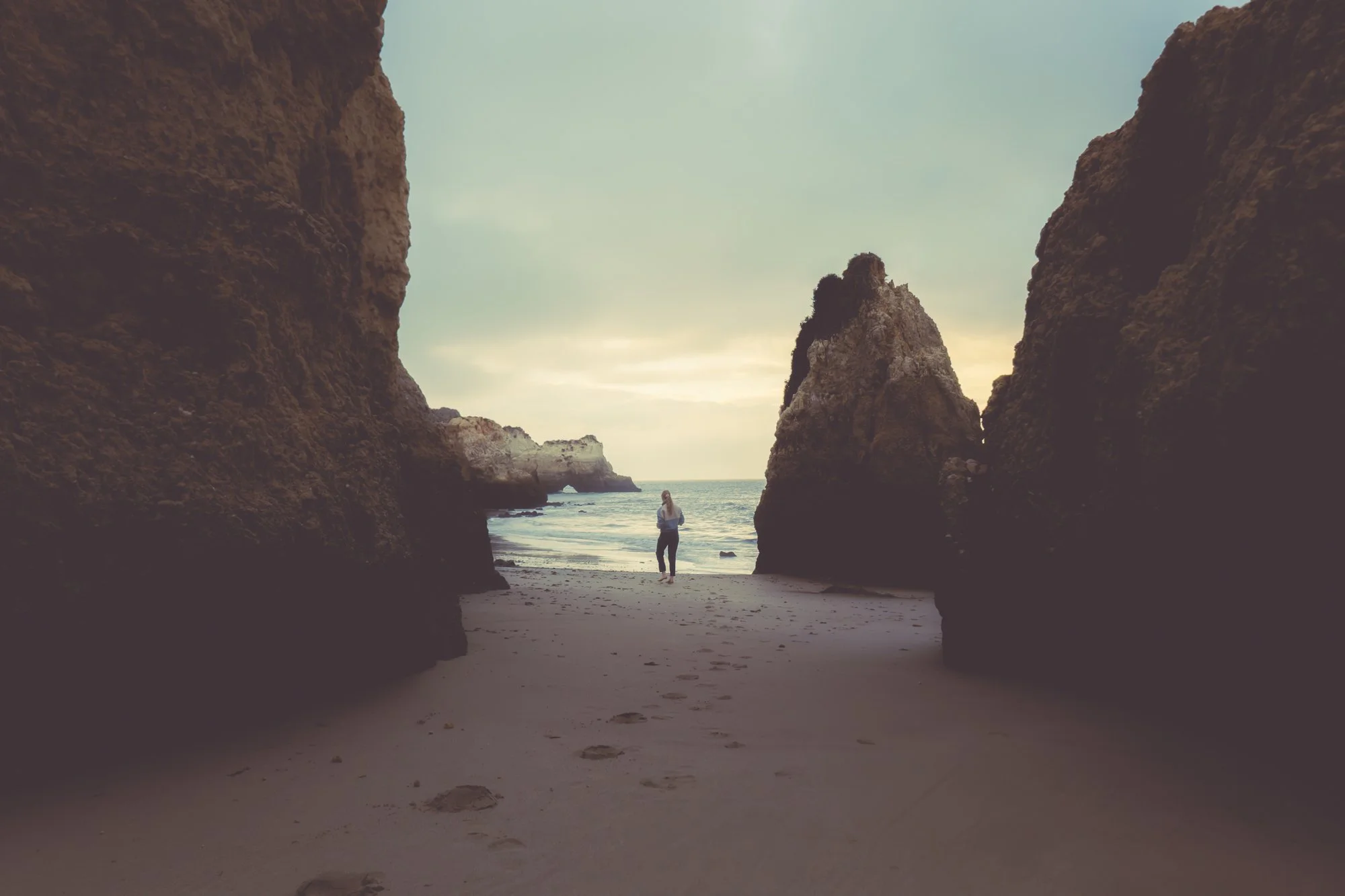 A person standing on a beach between two large rock formations, with the ocean and a cloudy sky in the background.