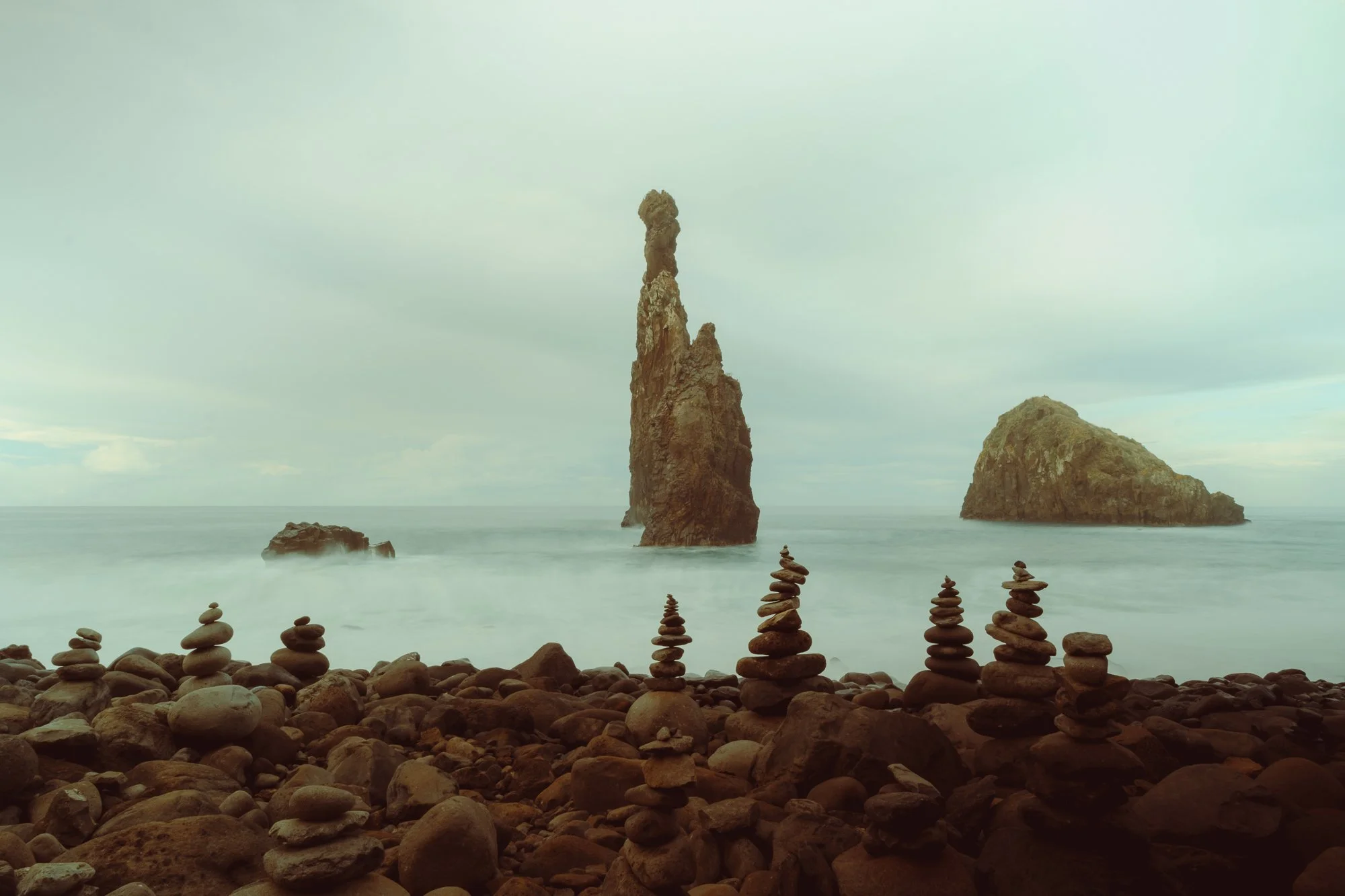Rock formations on a rocky beach with stacks of stones in the foreground and tall sea stacks in the background under an overcast sky.