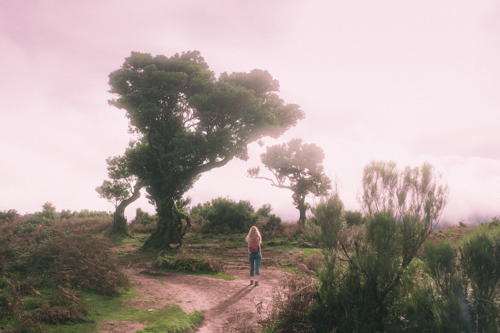 A woman with long blonde hair, wearing a pink backpack, jeans, and a green jacket, walking along a dirt path in a misty, wooded area with tall, twisted trees and lush greenery.