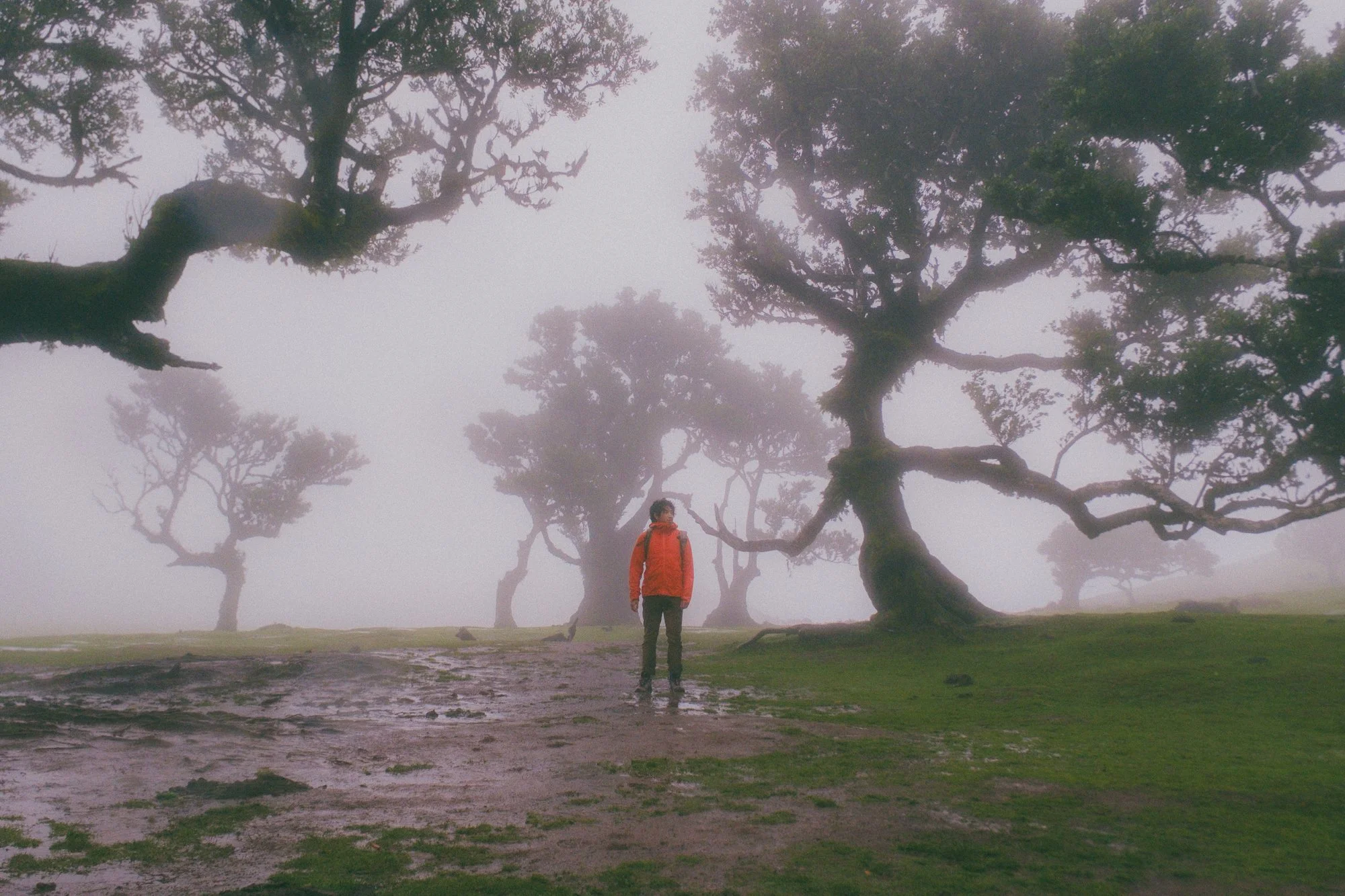 A person in a red jacket with a backpack walking through a foggy landscape with large, twisted trees and patches of wet ground.