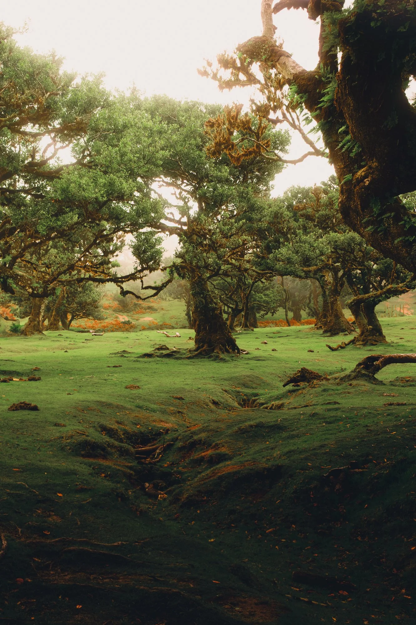 Lush green forest with ancient, twisted trees and moss-covered branches, with a faintly outlined sky in the background.