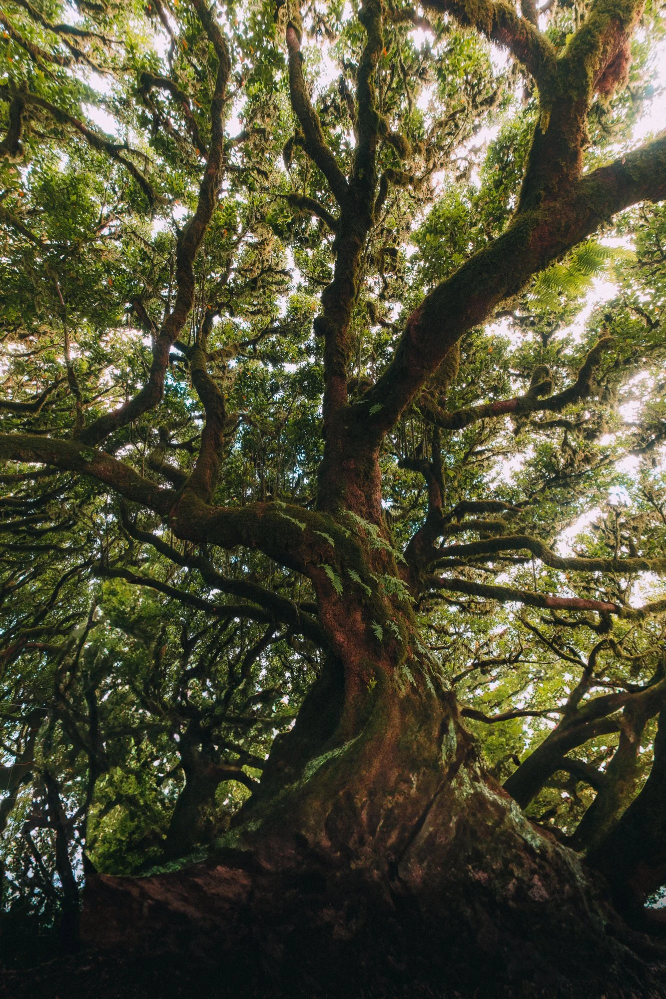 Low-angle view of a large, moss-covered tree with many twisted branches and green foliage, in a forest setting.