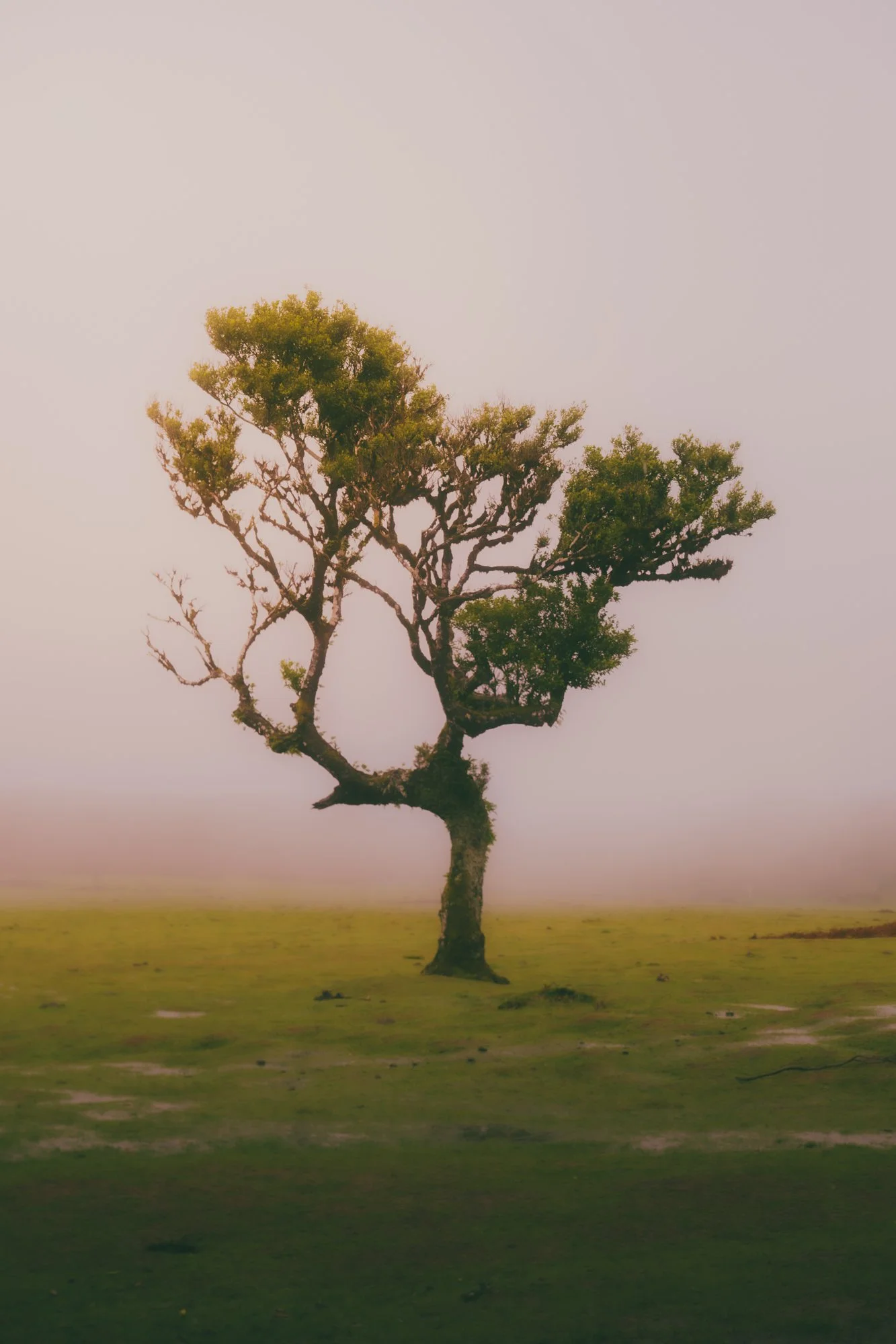 A solitary, gnarled tree standing on a grassy plain with fog in the background.
