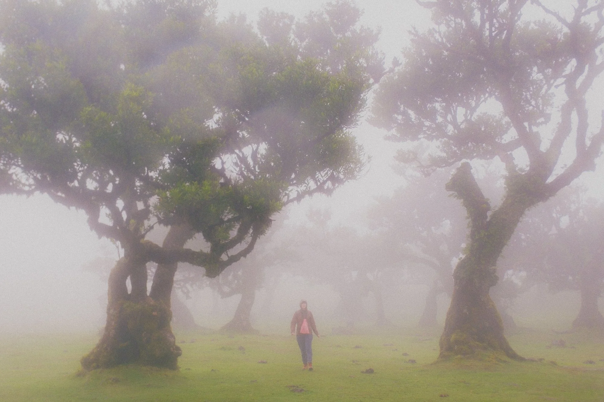 A woman walking through a foggy landscape with large, twisted trees and green grass.
