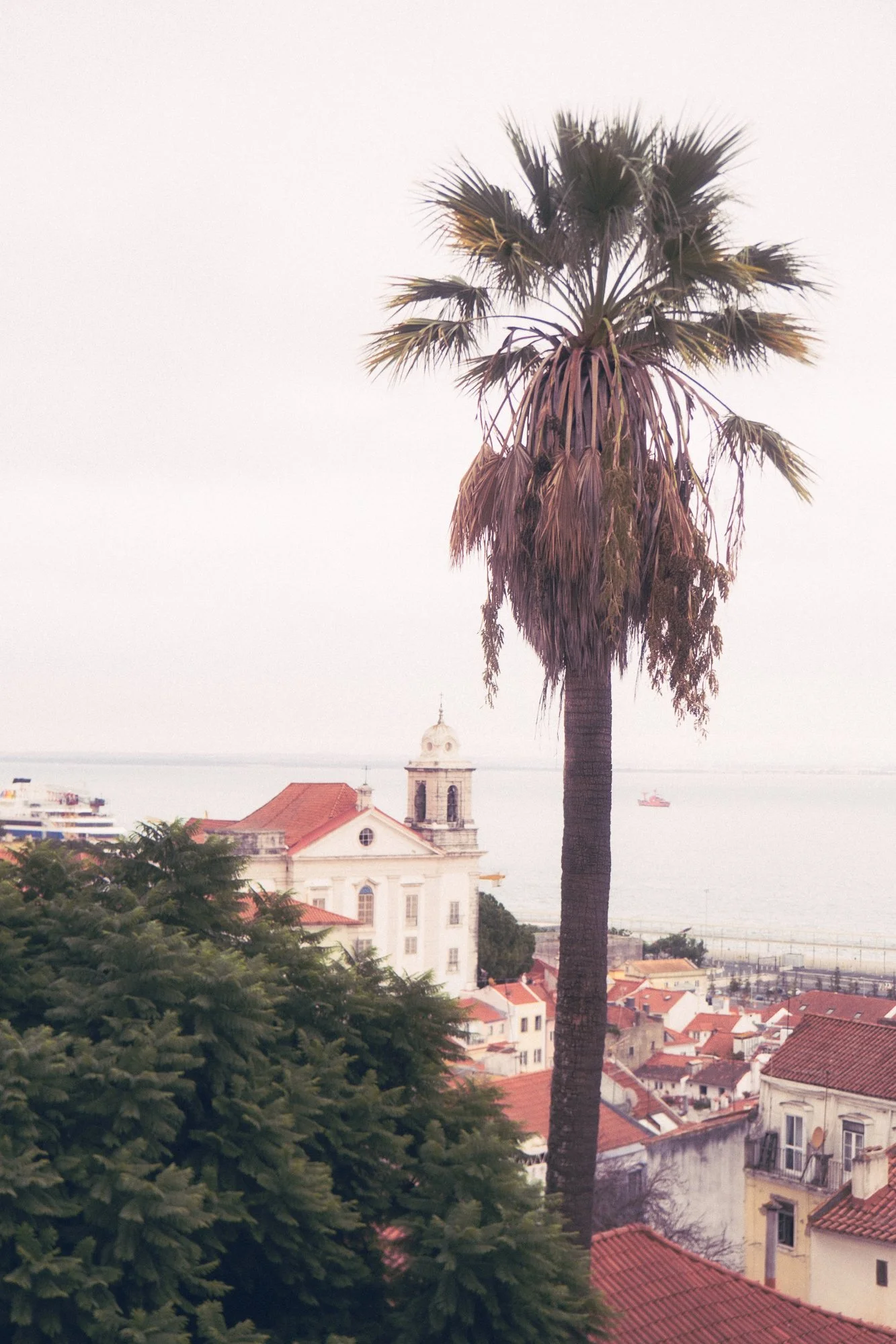 A view of a tall palm tree with a coastal town and the ocean in the background, featuring a white church with a small bell tower and red-tiled roofs.
