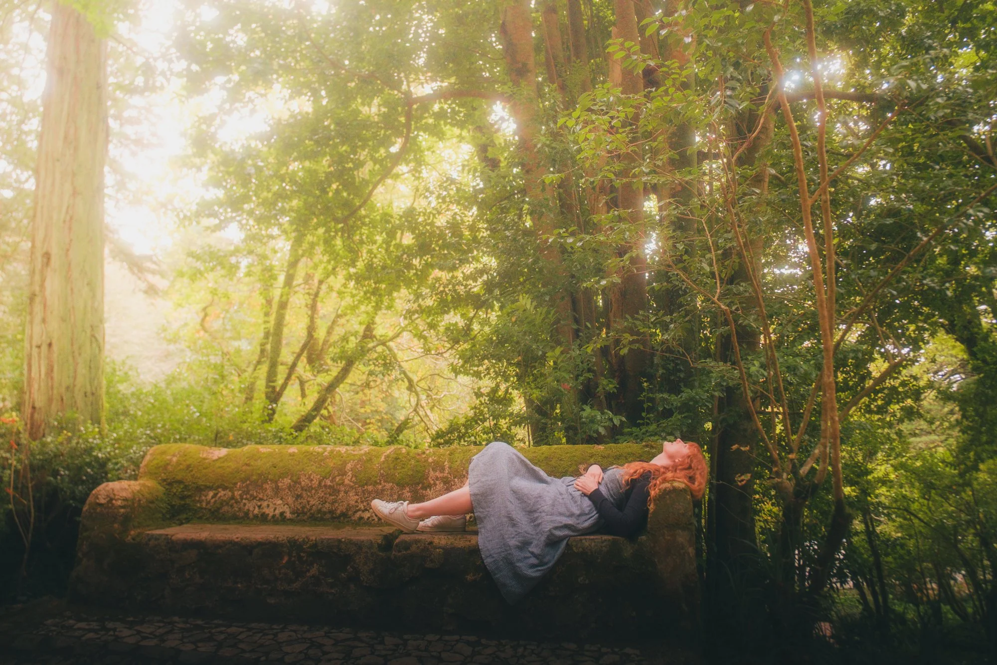A woman with long red hair lying on her back on an old moss-covered stone bench in a forest, surrounded by green trees and foliage, with sunlight filtering through the leaves.