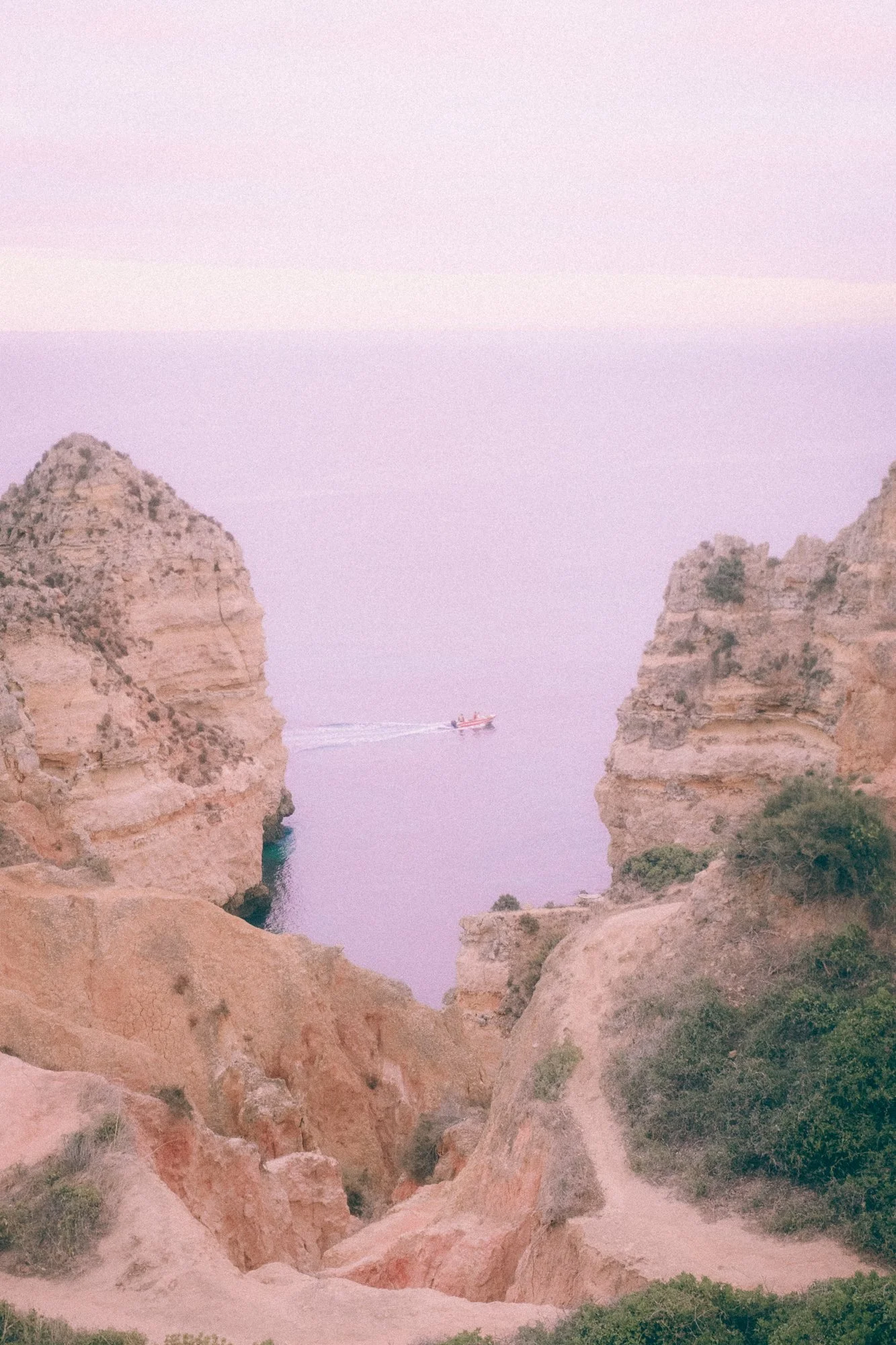 A peaceful view of a small boat sailing through a narrow rocky canyon on calm water, with pastel pink and purple skies above.