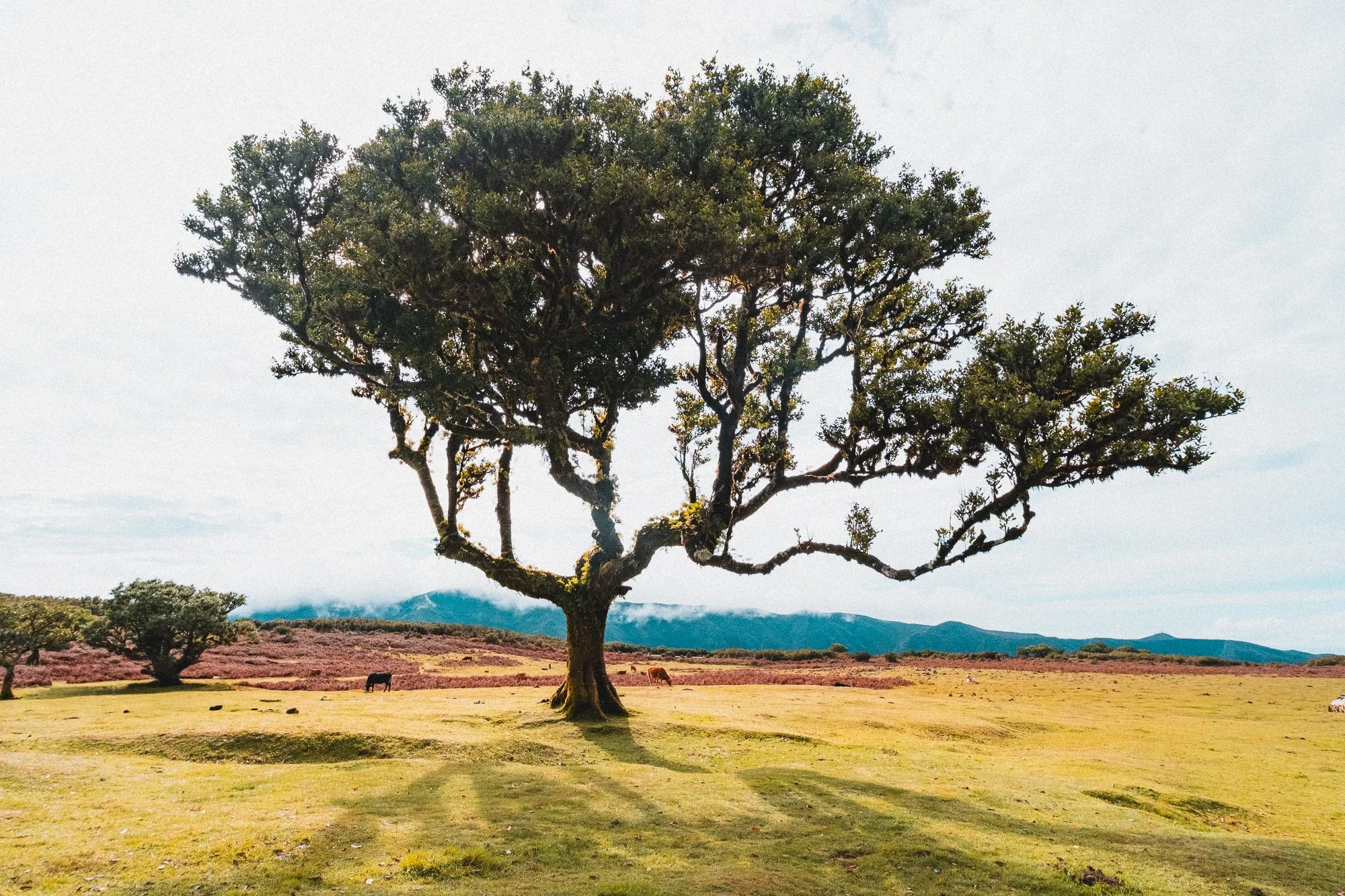 A large, sprawling tree stands in a grassy field with mountains in the distance and a cloudy sky above.