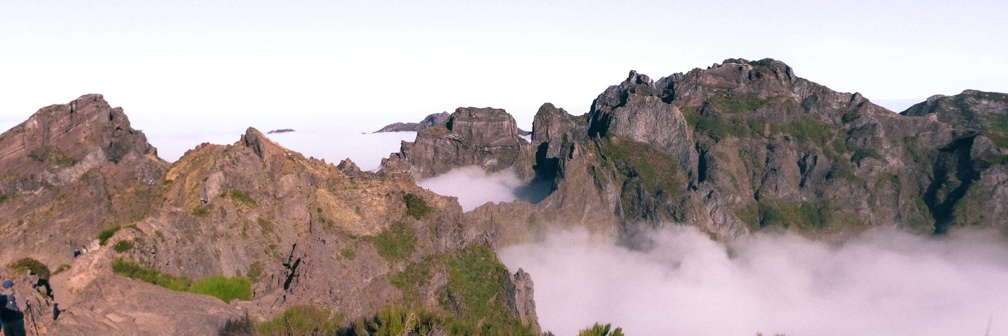 Rocky mountain peaks with green vegetation and fog in valleys under a clear sky.
