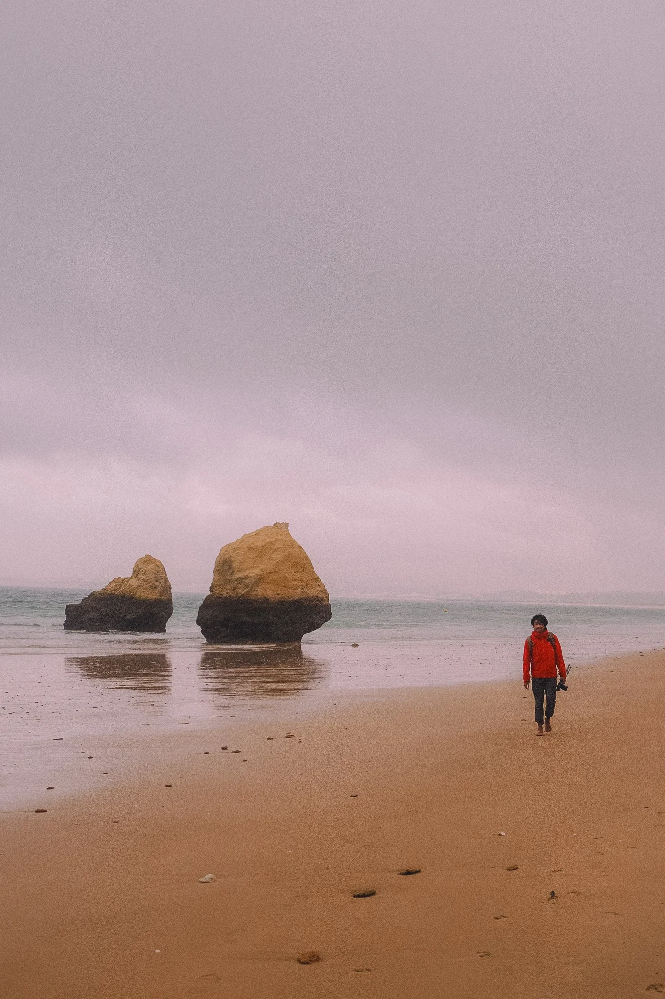 Person wearing a red jacket walking along a sandy beach with two large rocks in the water and an overcast sky.