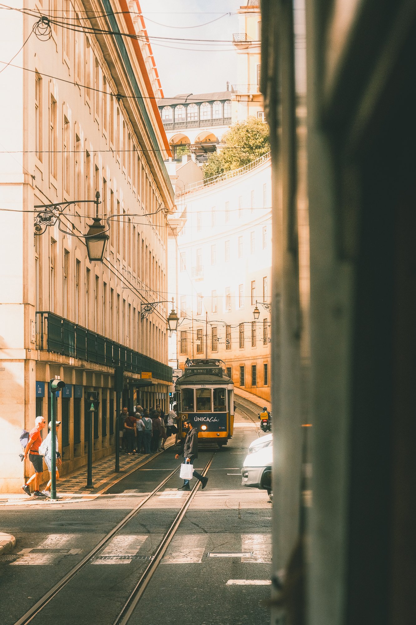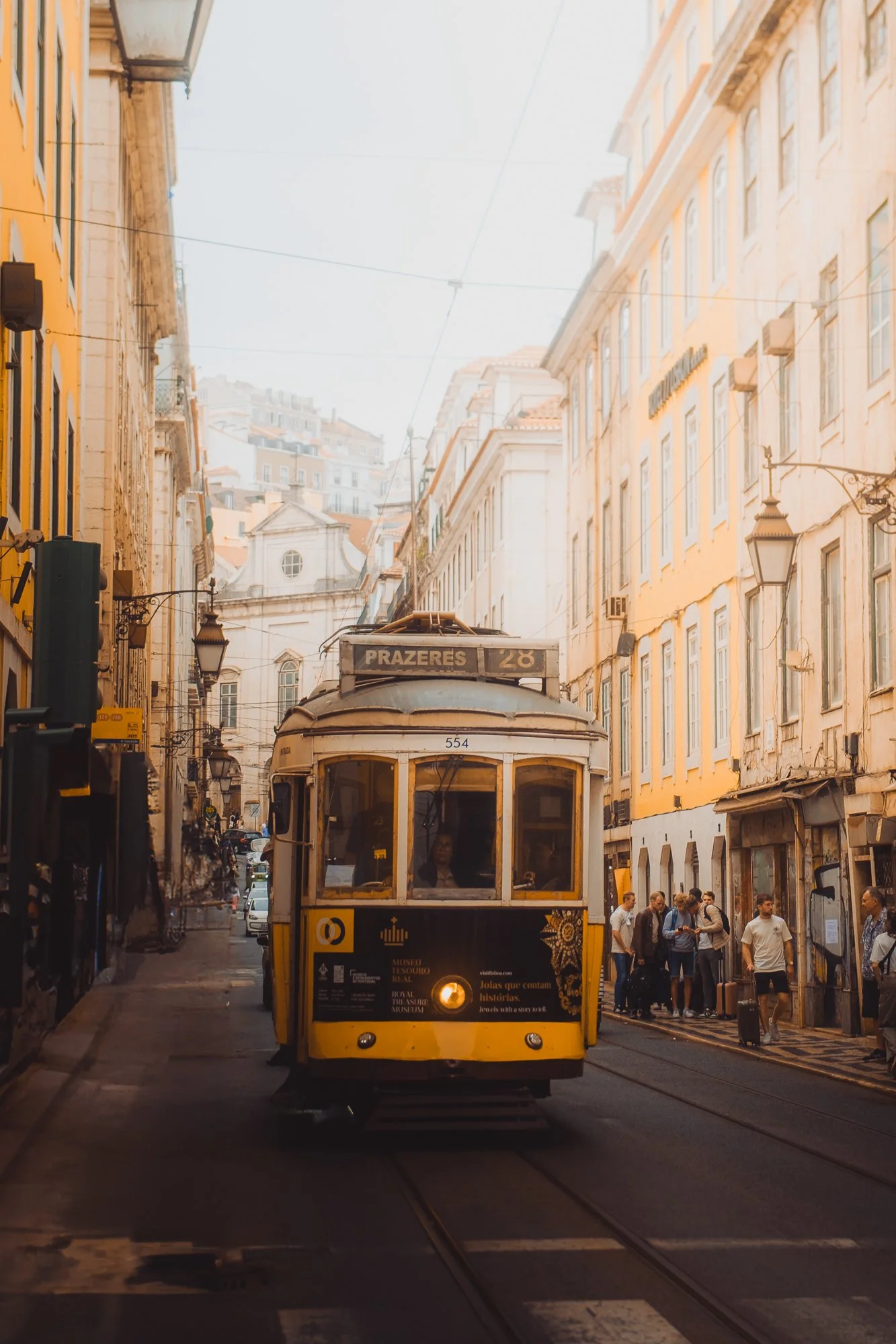 A vintage yellow tram with an advertisement on the front, operating on route 28 in Lisbon, Portugal, with a group of people waiting at a tram stop while other pedestrians walk on the street, surrounded by historic buildings.