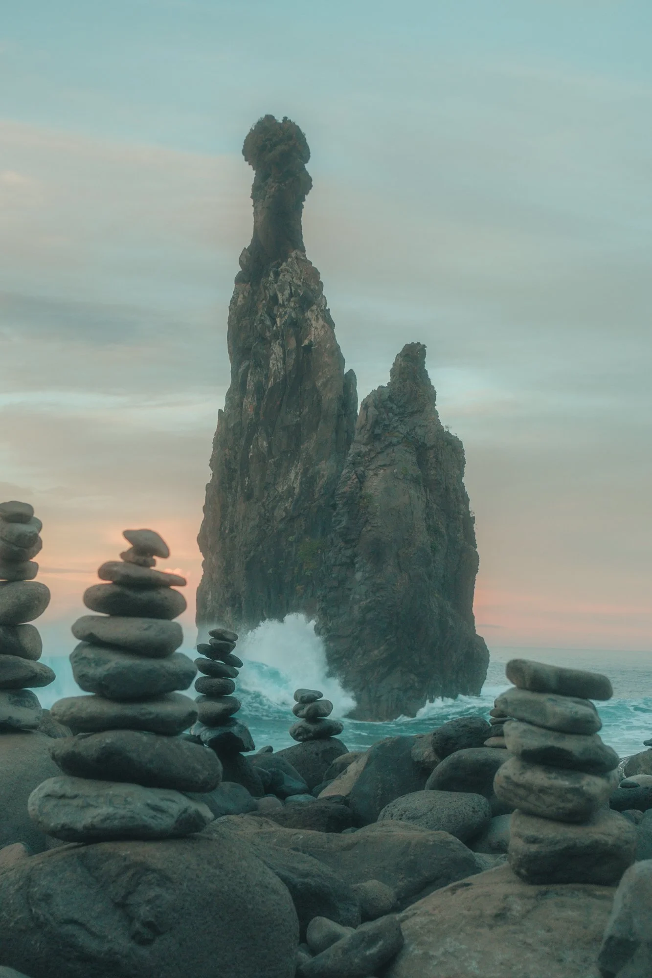 A coastal scene at sunset with a large sea stack in the background and several smaller stacked rocks in the foreground.