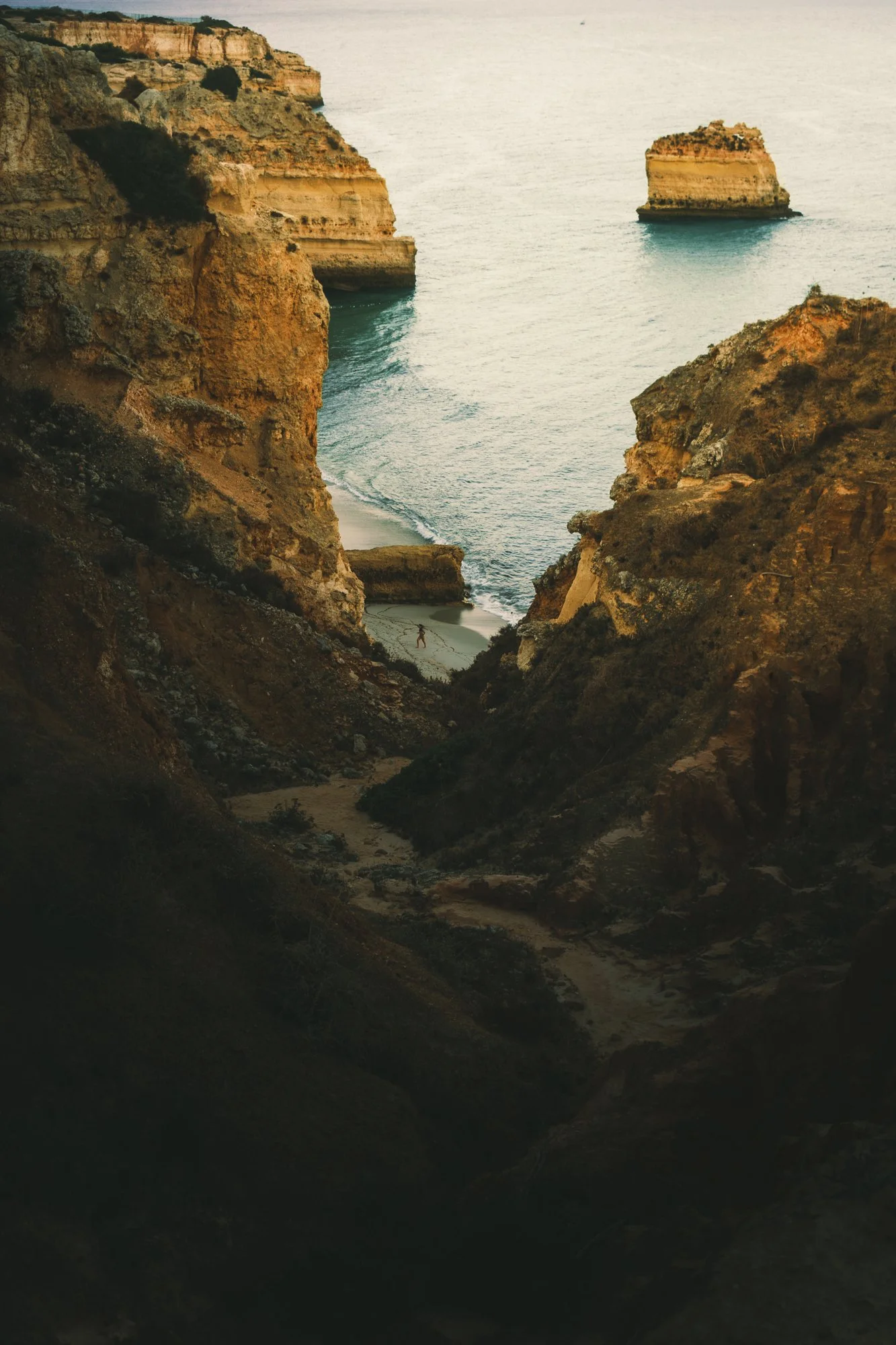 Cliffs overlooking a beach with a rocky formation in the water, a person walking on the sand, and the ocean in the background.