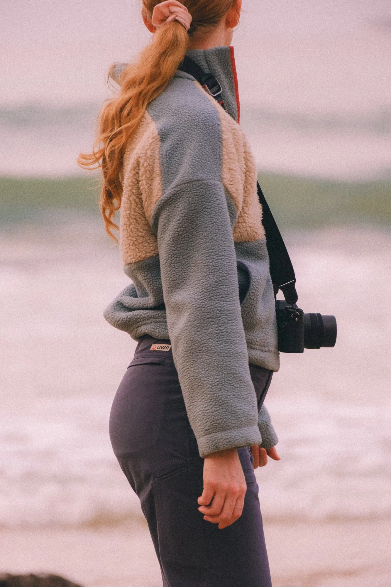 A woman with long red hair wearing a fleece jacket and dark pants, with a camera hanging around her neck, standing outdoors near water highlighted by a blurred background of waves.