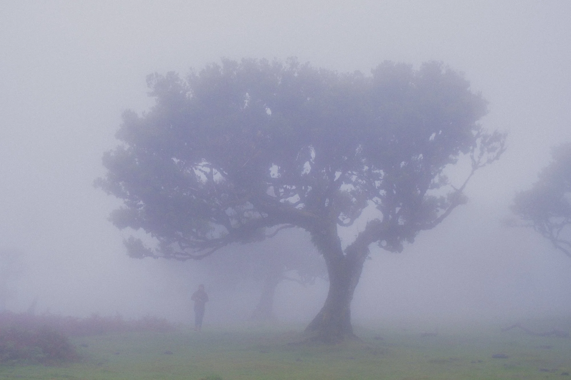 A person walking among twisted, moss-covered trees on a grassy landscape during foggy weather.